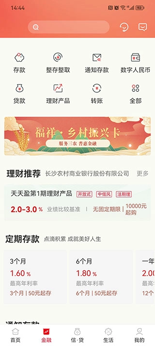 用户点击屏幕下方的金融按钮,即可进入金融服务页面,在此页面能够办理存款、理财等业务。