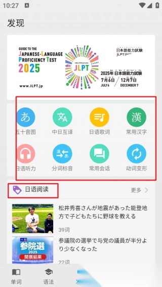 3. 探索发现板块:点开“发现”界面,即可启用五十音图学习、假名标注、日语分词、中日互译等实用功能,让学习体验更加丰富多彩。