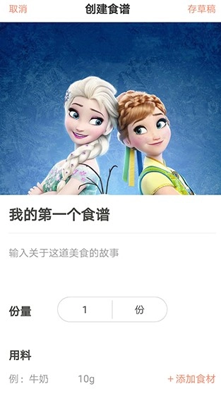 - 点击“上传食谱”这一选项,随即开启电子食谱的制作。