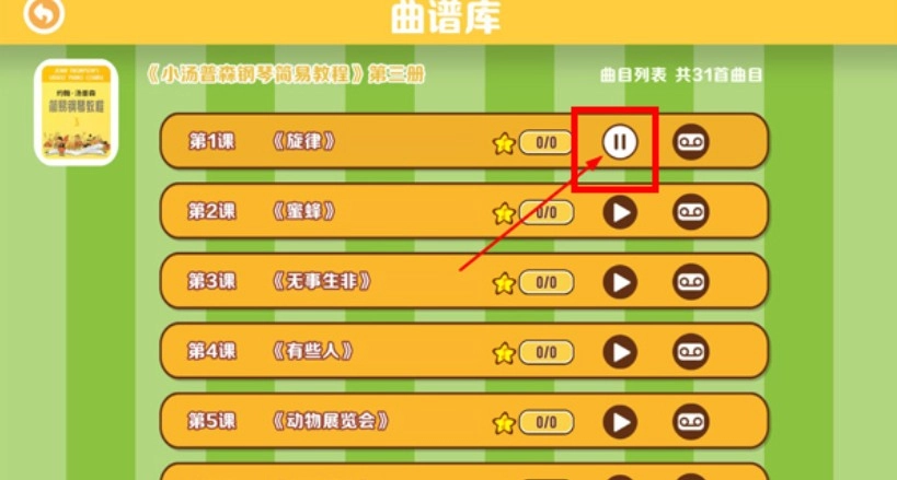 完成操作后,点击进入曲谱的主页面。接着,点击曲目旁的播放按钮,就能播放该曲目以展开学习。