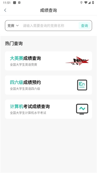 2、接着在成绩查询页面,输入要查询的竞赛名称,点击【查询】按钮。