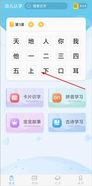 1. 打开于本站安装的幼儿认字应用。进入界面后,大家可以看到首页、英语、更多以及我的这几个版块,点击首页的内容,就能轻松开启学习之旅。