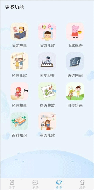 4、于更多板块里,为大家呈现了形形色色的小故事、儿歌以及百科内容,轻点即可查看详细信息。