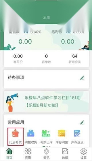 1. 第一步,打开乐檬零售,进入首页后挑选门口补货。