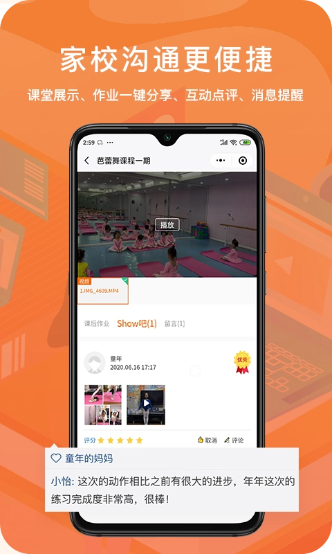 (2)课业点评:只需一部手机,就能便捷地对学生课堂表现进行点评,家长可随时知晓孩子的学习状态,以此激励学员持续进步。