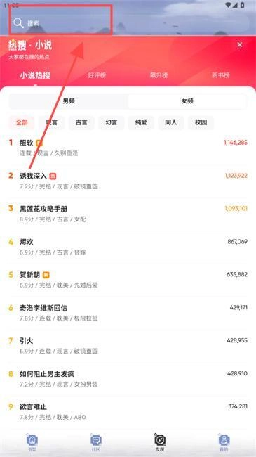3、接着在首页通过搜索功能查找想看的小说资源。