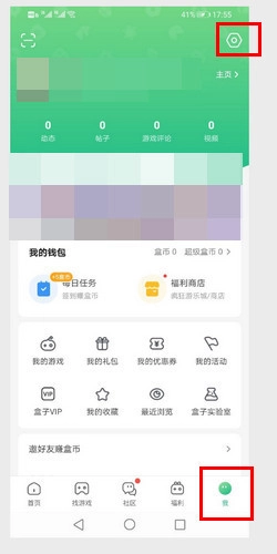 1、打开4399游戏盒手机版之后,点击“我”,选择右上角设置按钮;