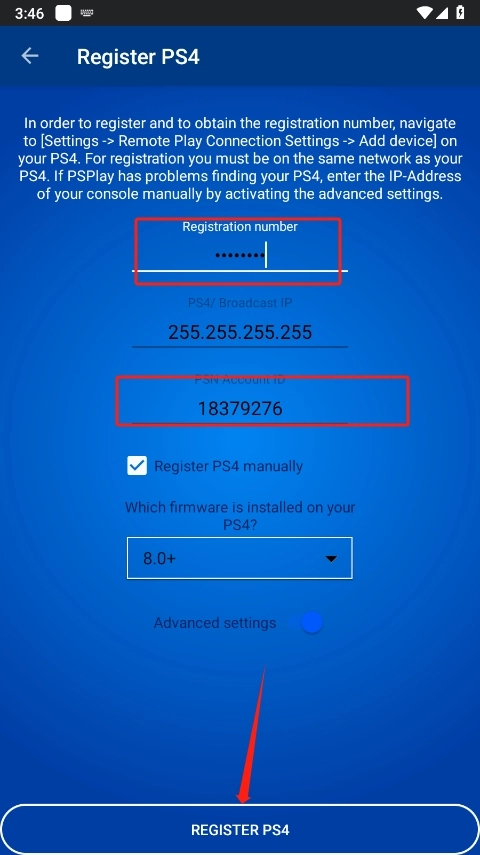 3、选中“Register PS4 manually”,填入注册号与ID后点击“REGISTER PS4” 。