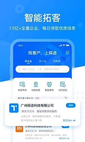 探迹 探迹拓客是一款功能十分强大的手机软件,它借助AI智能外呼与NLP技术的融合,达成了迅速量化客户画像以及快速获取客户联系方式的目的。这款应用具备全方位剖析企业、精准获取客户、降低获客成本等特性,为用户打造出一个客户专属的通讯录,并赋予全方位的价值体现。用户在使用时,不但能够高效地触达大量客户,还能够一次外出就实现对多个客户的拜访,进而提升工作效率与销售业绩。