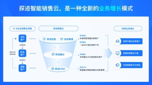广州探迹科技有限公司作为专业的智能销售服务SaaS供应商,专注于运用大数据与AI技术,助力企业全方位提升销售效率。探迹持续对全网公开信息进行挖掘与分析,并融合NLP、机器学习算法等人工智能手段,面向ToB企业,提供涵盖线索挖掘、商机触达、客户管理直至成单分析的全流程智能销售SaaS服务。旨在协助企业攻克在找寻、联络以及管理客户过程中遭遇的销售困境,高效获取精准销售线索,削减获客成本,进而全方位提升销售效率与业绩。