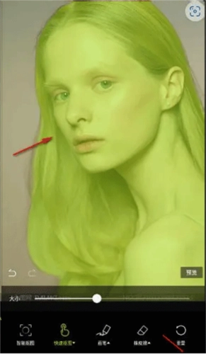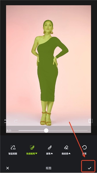 在此处,我们点击“快速抠图”操作选项,接着选中图片里的背景部分,把需要抠图的人像完整且完美地抠取出来,最后点击“√”选项,进行保存确认就可以了。