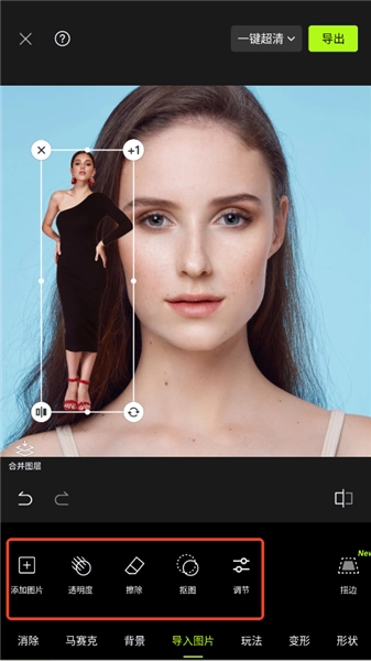3、打开图片后,在众多功能中,除了常见的日常精修图片功能外,留意并点击位于最右下方的抠图按钮,随后执行抠图操作。