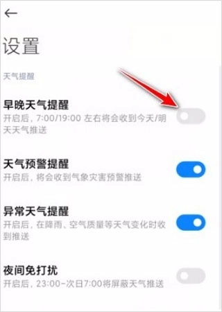 4、接下来在设置页面里,于页面上找寻“早晚天气提醒”选项,能看到此选项后方有一个开关按钮。