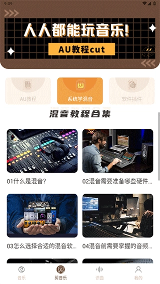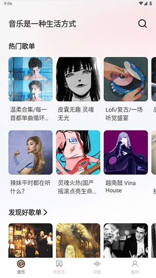 1、进入本站后打开软件,软件首页下方有剪音乐、识曲以及听音乐几个列表。