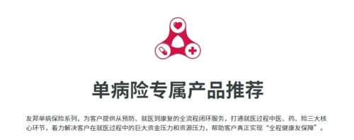 友邦单病保险系列,为客户打造从预防、就医直至康复的全流程闭环式服务体系,成功打通就医过程中医、药、险这三大核心环节,致力于化解客户在就医过程中面临的沉重资金压力与资源压力,助力客户切实达成“全程健康,友邦保障”的目标。