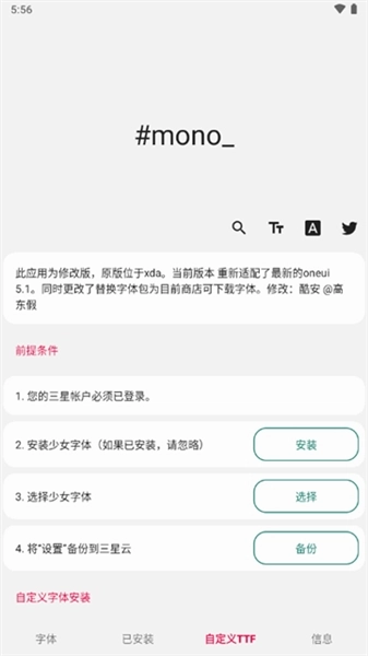 三星mono换字体 三星mono换字体是一款极为实用的字体工具,能助力三星用户更改默认的显示字体。举例来说,像可爱的少女字体,已集成在安装程序中,安装便捷。用户还可在该平台自定义字体,操作十分简易,仅需输入对应的字体信息,再挑选心仪的颜色,就能生成所需字体。这款应用的整体界面简洁清爽,上手进行字体替换方便快捷。