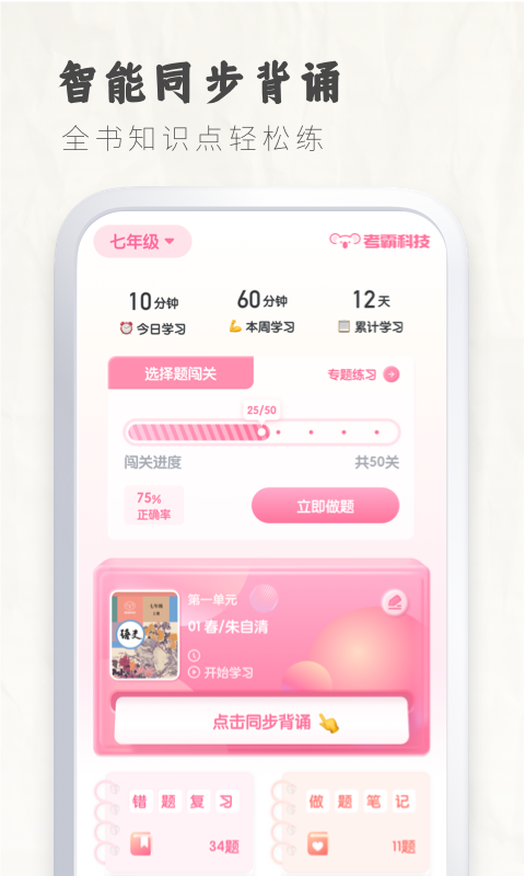 1、辅助用户在这里进行背诵语文知识,巩固知识点进行学习