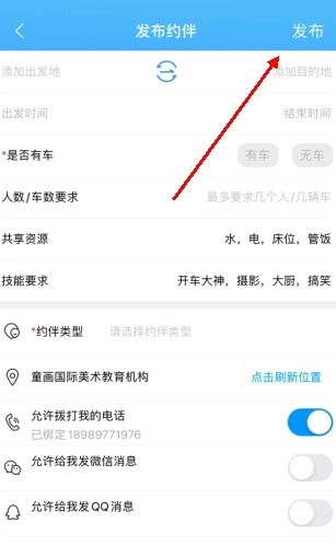 3、把我们的约伴信息和联系方式发布出去,操作发布就行!