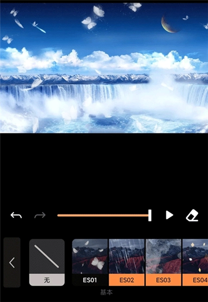 6、接下来点击“覆层”,在其中挑选图中展示的“ES09”效果,此效果会添加飞舞的蝴蝶,你也能够选择添加其他特效。完成选择后,点击右上角的“导出”按钮。