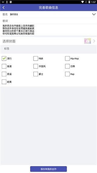 5、最后对歌曲信息进行完善,点击下方“保存到我的创作”按钮即可。