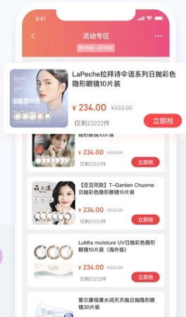 眼镜圈平台的服务产品涵盖:隐形眼镜、护理液、眼镜架、光学镜片、太阳镜,以及眼镜行业相关的服务类商品、周边商品等。