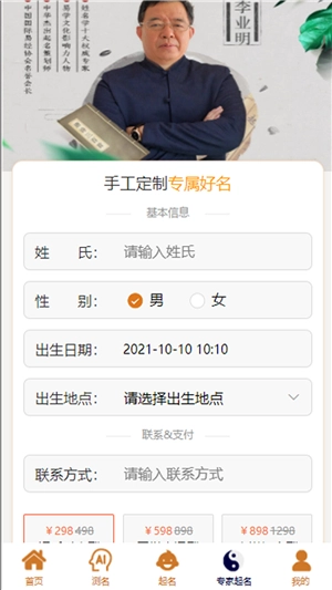3、最后还能手工定制专属好名,只需输入相关信息及联系电话即可。不过,人工取名需要付费。