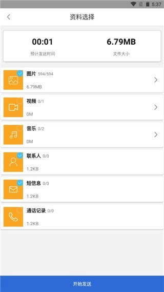 2. 挑选出你想要传输的图片、视频、联系人等各类文件,接着点击“开始发送”按钮。