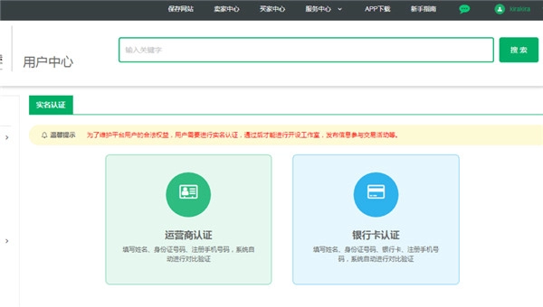 4、进入“用户中心”界面,点击实名认证选项,接着选择运营商认证方式,随后依据提示填写相关信息,最后提交审核。