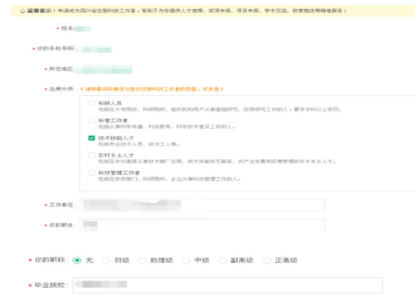 6、请依据提示信息仔细填写:点击“提交”(若申请成为科技工作者,将有助于为您提供人才推荐、奖项申报、项目申报、学术交流、政策推送等精准服务)
