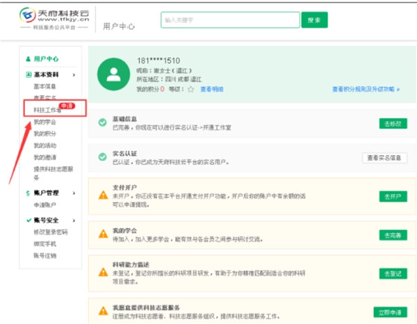 5、审核通过后,在左边的基本资料栏会出现“科技工作者申请”选项,点击该选项“科技工作者”。