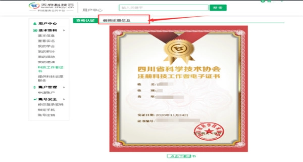 7、已成功提交,待审核通过后,刷新页面,进入“用户中心”,点击“科技工作者证书”查看,也可按需点击“证书”。