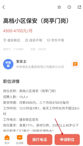 3. 查看职位详细信息后,既能够拨打电话,也可以直接申请该职位。