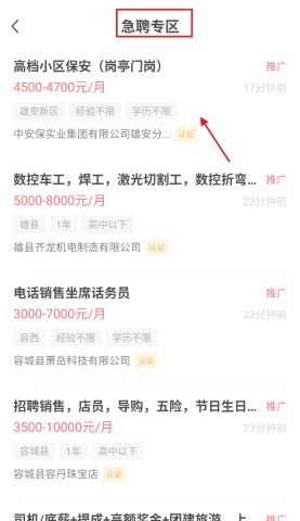 2. 在急聘专区,能够快速找到适合的工作,直接点击感兴趣的职位。