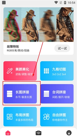 1、第一步,打开照片切图与拼图,接着找到【长图拼接】选项并点击,操作很简单,直接动手就行。