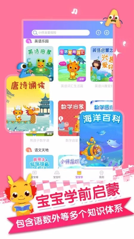 动画:英语、互动故事、唐诗、生活习惯等,让宝宝和小伴龙一起探险七彩大陆,感受小伴龙动画的魅力。