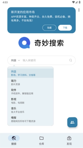 奇妙搜索手机版是一款功能强大、专业可靠的手机磁力资源检索查询软件,它先进的ai推荐算法和多款搜索引擎,可以智能识别用户的检索需求,为你带来精准、可靠、详实的查询结果,还支持音乐、光盘、嗅探等多种不同的搜索功能,想找什么都可以,喜欢的小伙伴快来奇妙搜索手机版试试吧。