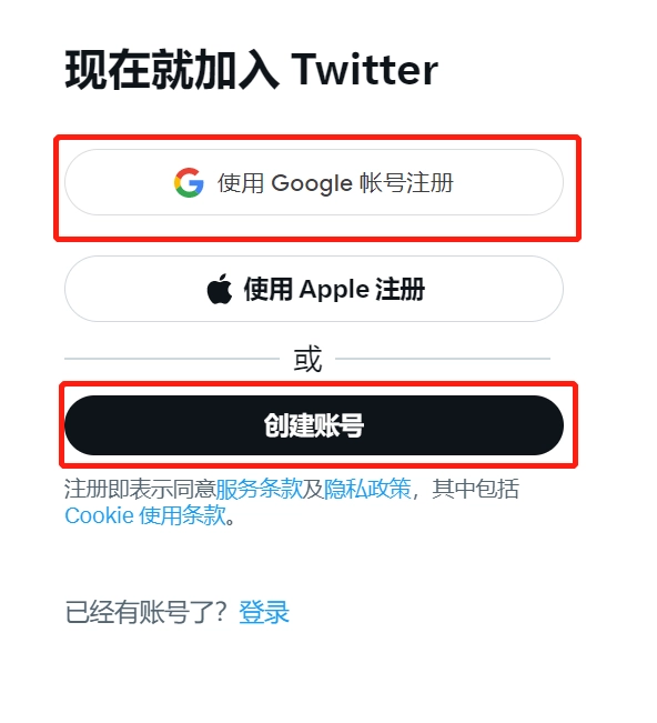 要是拥有Google账号,能够直接点击“使用Google账号注册”。在此处,需通过点击“创建账号”按钮来创建推特账号。