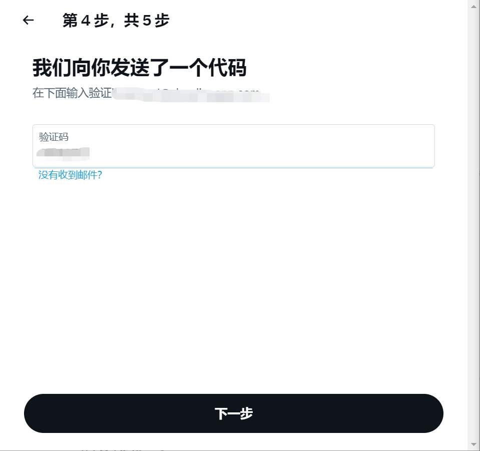 前往注册邮箱,查看推特发送的验证码,接着把验证码填入相应位置,最后点击“下一步”。