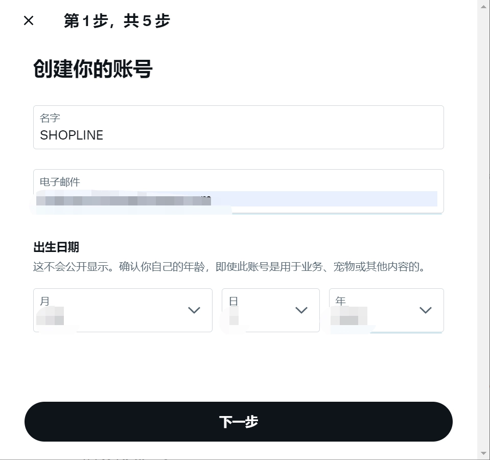 在填写完名字、电子邮件和出生日期后,点击“下一步”。