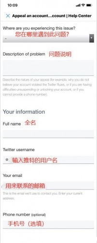 填写您在哪里遇到此问题,全名和推特用户名以及用来联系的邮箱。