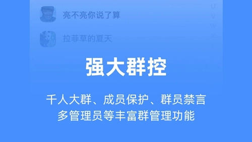3、强大群控:千人大群、成员保护、群员禁言多管理员等丰富群管理功能。