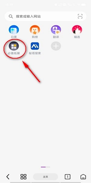 1. 开启可拓浏览器后,点击“必备拓展”,也就是下图箭头所指之处。