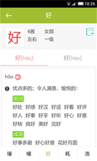 本内容收录2万+汉字,涵盖汉字基本信息、汉字解释、同义字、反义字及相关组词。其中,组词进一步细分为以该字开头的组词、以该字结尾的组词,以及该字在中间的组词。检索时,支持使用拼音字母进行快捷检索,十分便捷。