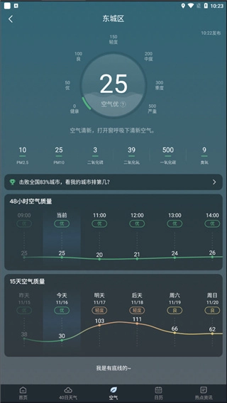 5、于空气栏处,能够查看当前所在城市的空气质量,以及PM2.5、二氧化硫等空气污染相关状况。