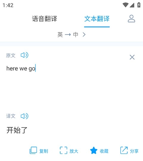 3、比如在进行英译汉时使用文本翻译功能,在下方的输入框中输入相应英语文本,接着点击右侧的✓即可完成翻译。翻译完成后,你能够对翻译内容进行复制、收藏以及分享操作。