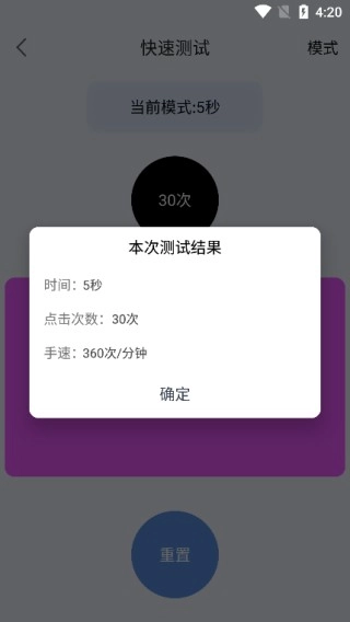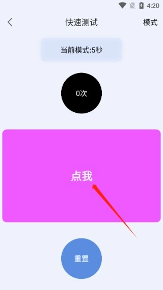 2、就拿快速点击来说,进入后,在右上角能看到“模式”,通过它可以修改点击测试时间。