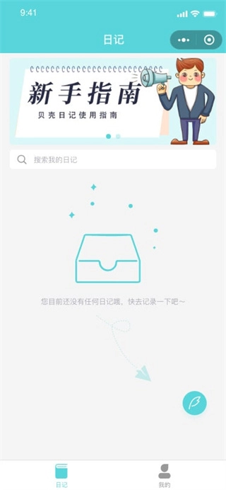 1、在本站点击安装并打开,首次进入贝壳日记本时,列表呈现为空状态,点击上方的羽毛笔按钮,即可开启写日记之旅。
