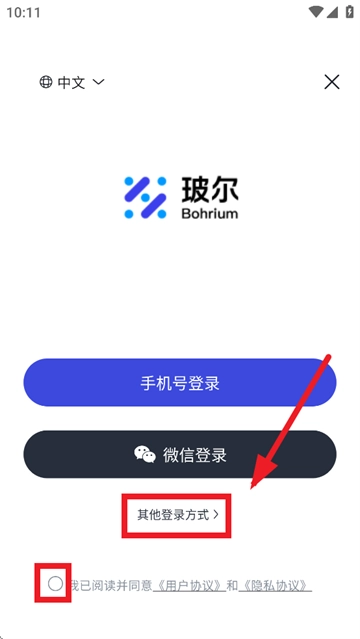 首先安装玻尔软件,安装完成后打开它。待进入登录界面,在界面中勾选“我已阅读并同意《用户协议》和《隐私协议》”,随后点击“其他登录方式” 。
