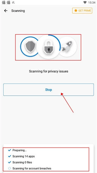 2、软件在此处会从三个方面展开检测,若想暂停,点击stop即可。