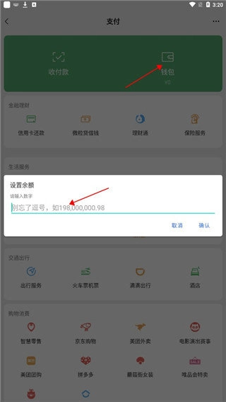 3、轻点钱包,进行余额设置,注意填写时要加上逗号。